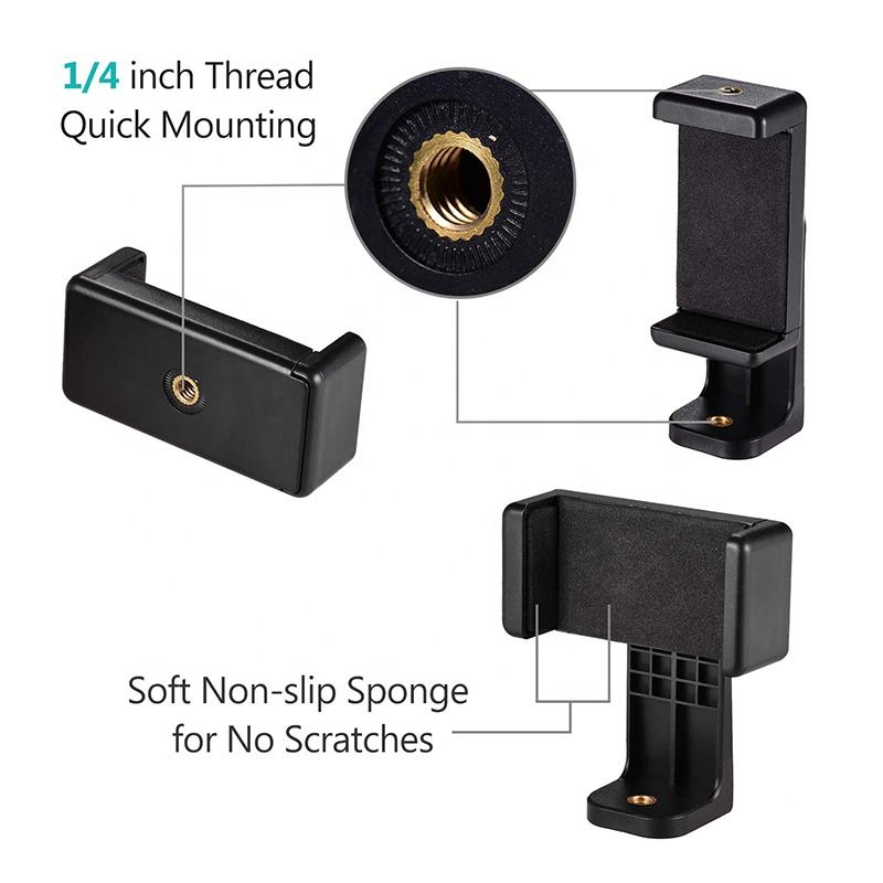 1.The phone clamp rotates 360° and tightens with a knob, working for both upright and sideways photos.2.Made of durable plastic and soft rubber, it protects and lasts long.3.For added convenience, the phone clamp can be detached to function as an independent clamp, easily attaching to tripods with its 1/4 inch thread for versatile usage.4.Its small size makes it easy to carry and quick to set up, with strong plastic ensuring your phone stays in place.5.This clamp adjusts to fit many smartphone sizes, making it more useful and adaptable.